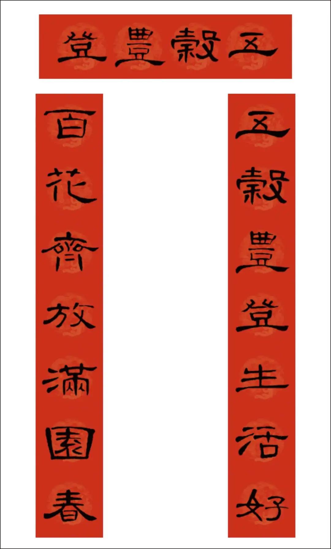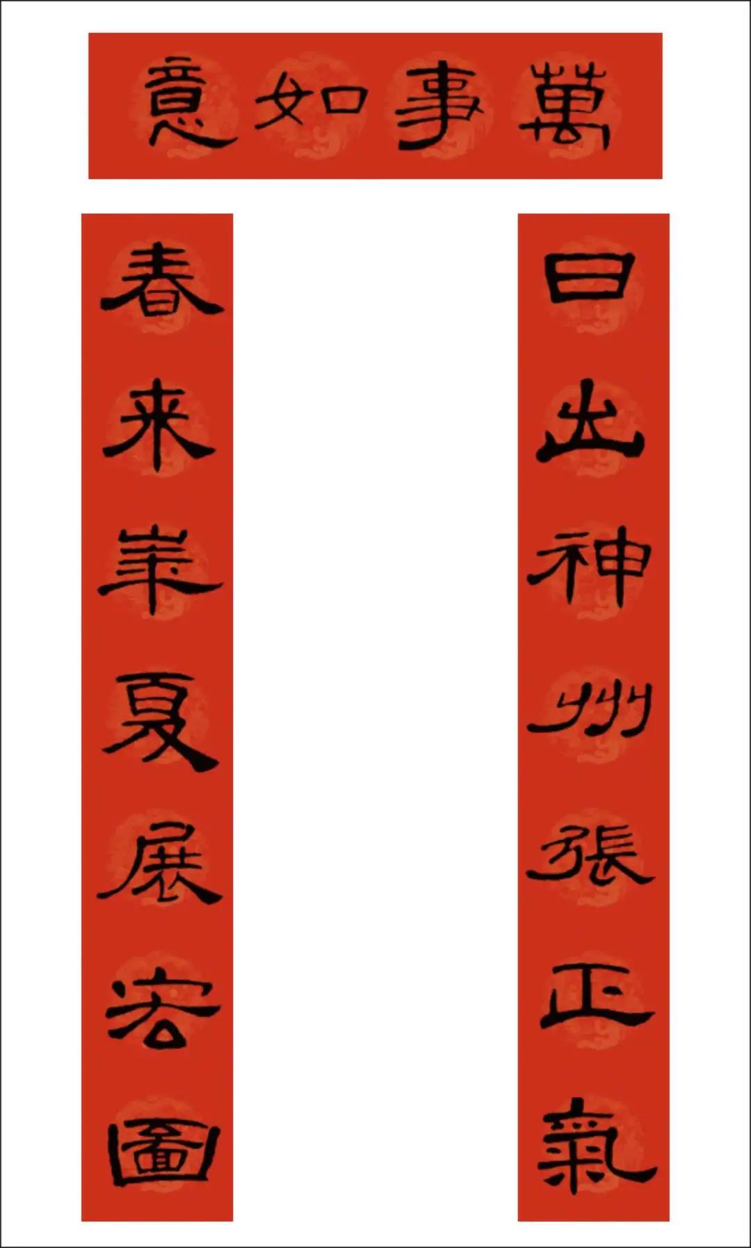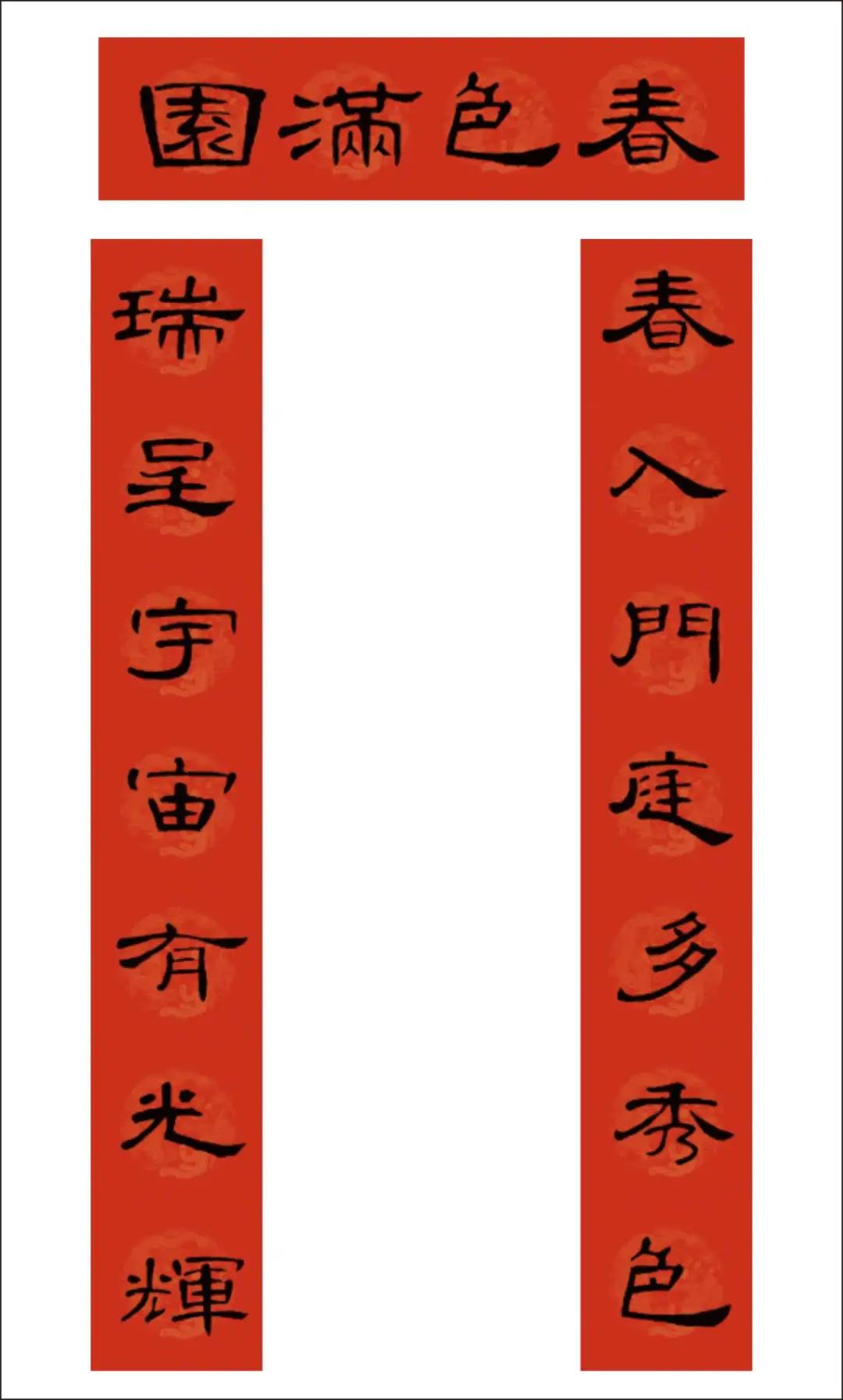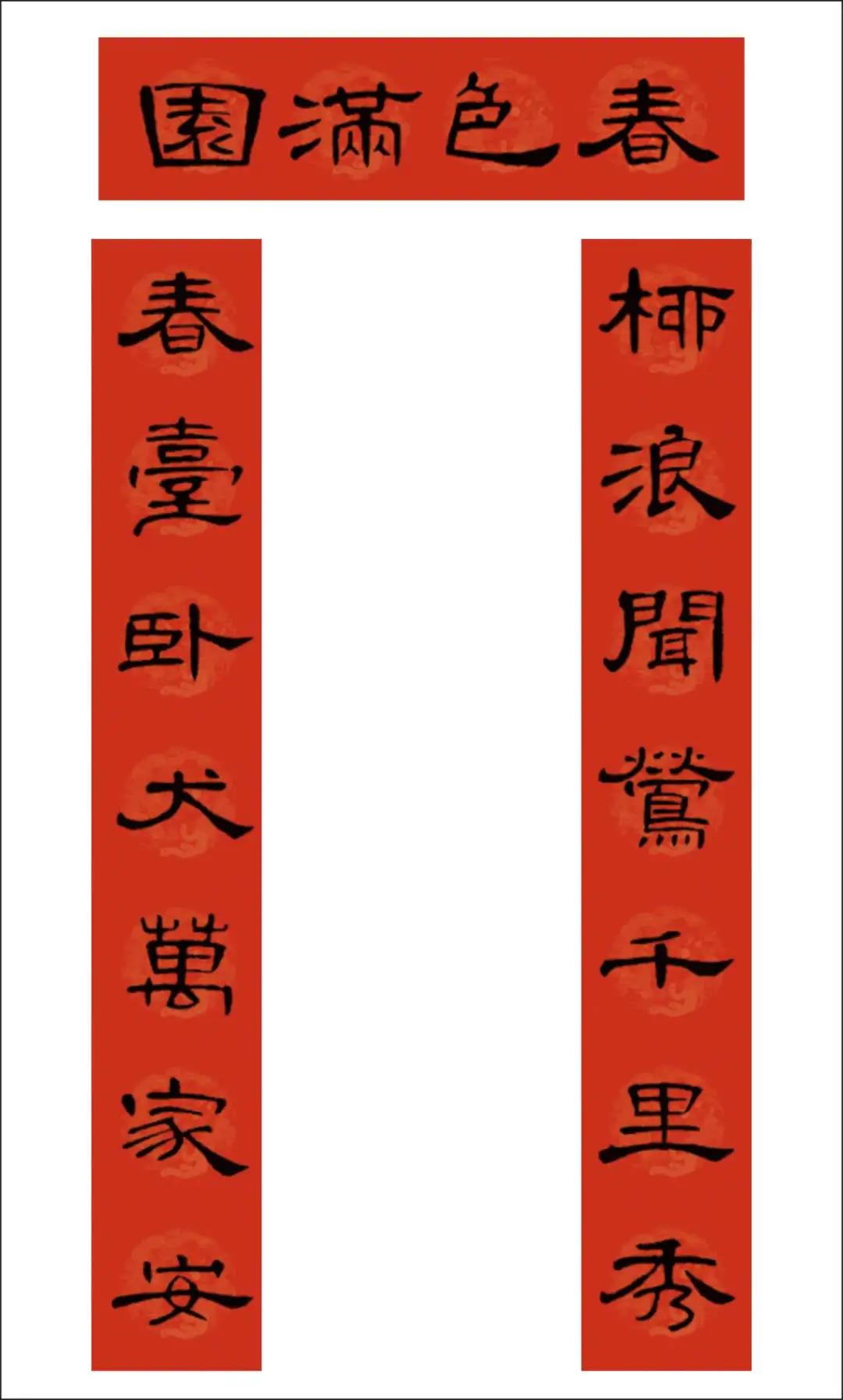 曹全碑集字书写的春联,圆实活脱刚柔相济,静穆润和严整美观。配上吉利讨喜的祝福语,喜庆的大红色春联纸张,春节的节日氛围顿感浓郁。正可谓:
