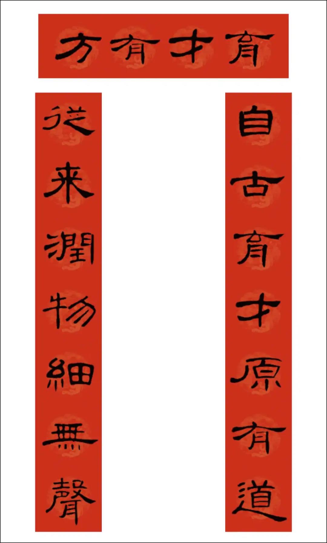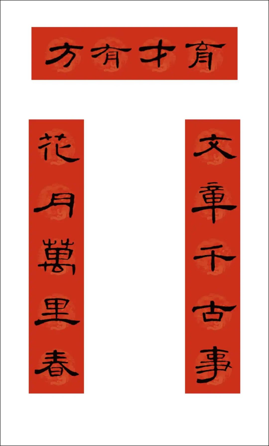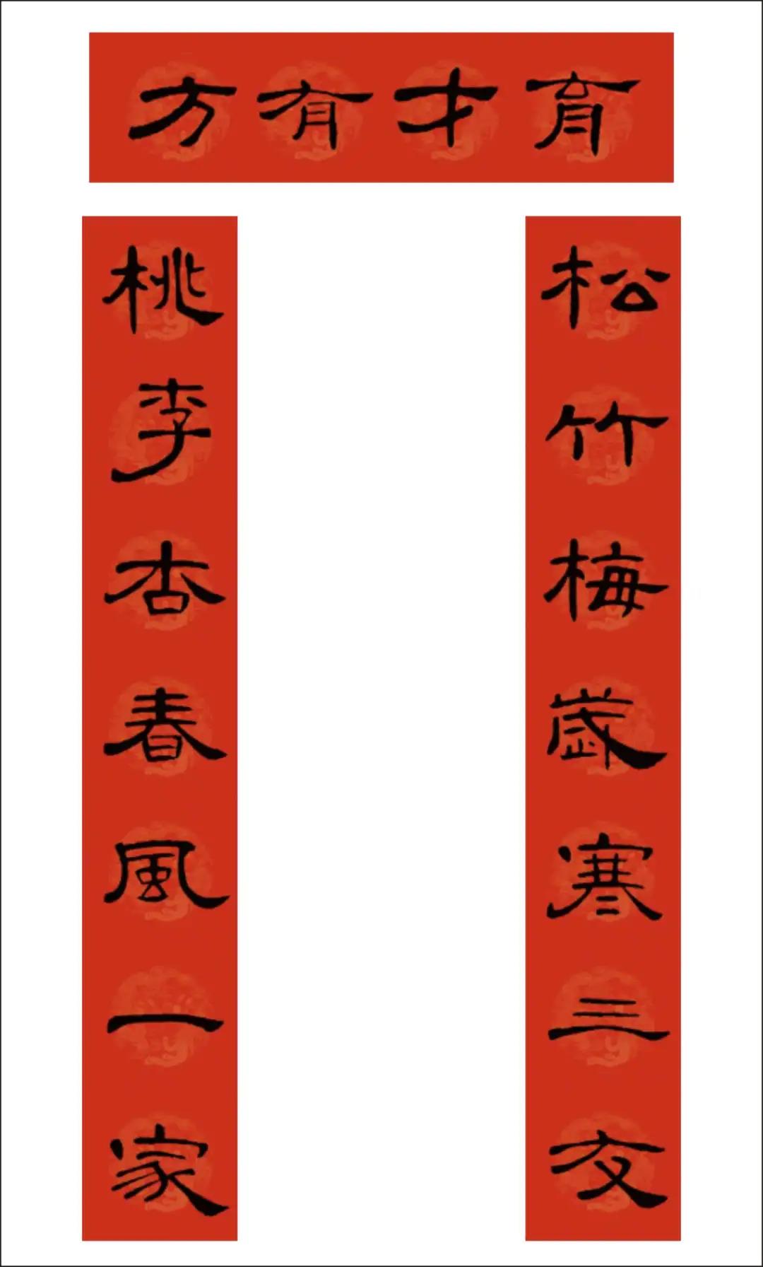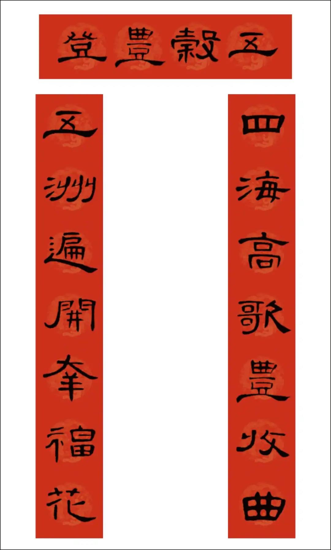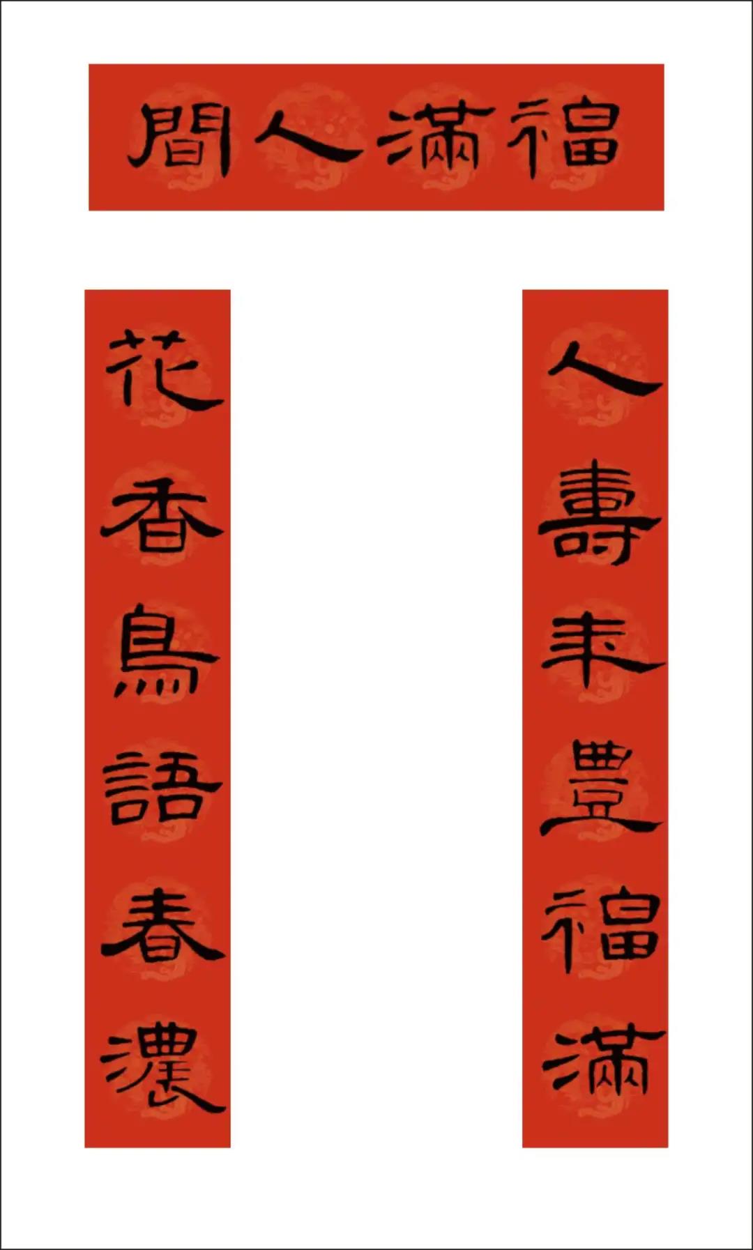 曹全碑集字书写的春联,圆实活脱刚柔相济,静穆润和严整美观。配上吉利讨喜的祝福语,喜庆的大红色春联纸张,春节的节日氛围顿感浓郁。正可谓: