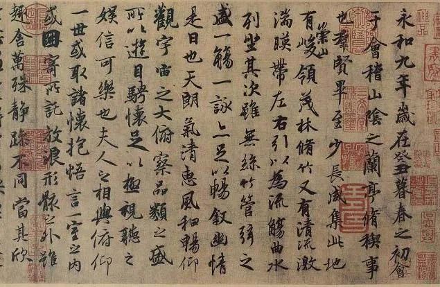 《兰亭序》是书圣王羲之书法代表作。整篇作品的笔法转换飘逸、结构变化浑然天成、重字多变令人叫绝,其章法、结构、笔法堪称行书的经典教材,被后世学书者尊崇为 “天下第一行书”。在书法史上具有独一无二的地位。