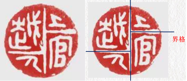 秦私印的界格不像官印那样,一般比较自由,由此产生许多有趣的处理。“上官越人”就是一方巧用界格的佳作。此印采用了斜角呼应的格局。采用非等量的界格,依四字文字的笔画多少界定位置。处理简明而高效。