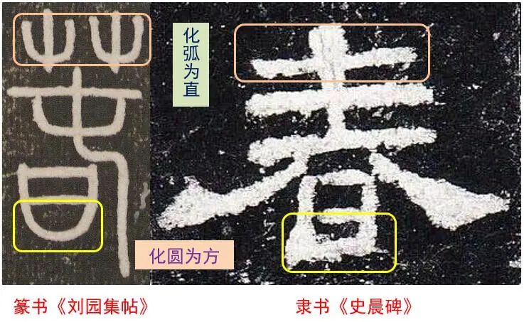 “化圆为方”、“化弧为直”为隶书简化篆书结构的两种方法。让隶字的结构更简洁,书写更迅速。