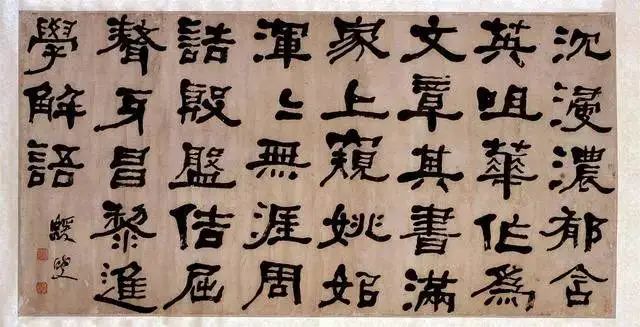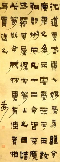 邓石如(1743—1815)安徽怀宁人。布衣,家贫。邓石如的隶书取《史晨》的娟秀,得《曹全》的遒丽,用《衡方》的淳厚,借《石门颂》的纵肆和《夏承》的奇瑰。结体严紧,遒丽浑逸,渗有魏碑意趣,揉进篆书笔法,气势雄强,笔法峻拔。在清代可算独树一帜,对后人颇有影响。