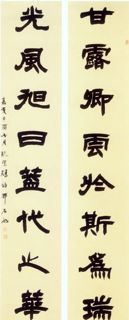伊秉绶(公元1754-1815年) 清代具有特色的隶书家,笔法精熟,结体宽博方正,线条粗细变化,笔画强劲,具有磅礴气势。何绍基说他:“丈人八分出二篆,使如漆楮如简”。蒋宝龄说他“尤以篆隶名当代,劲秀古媚,独创一家。”