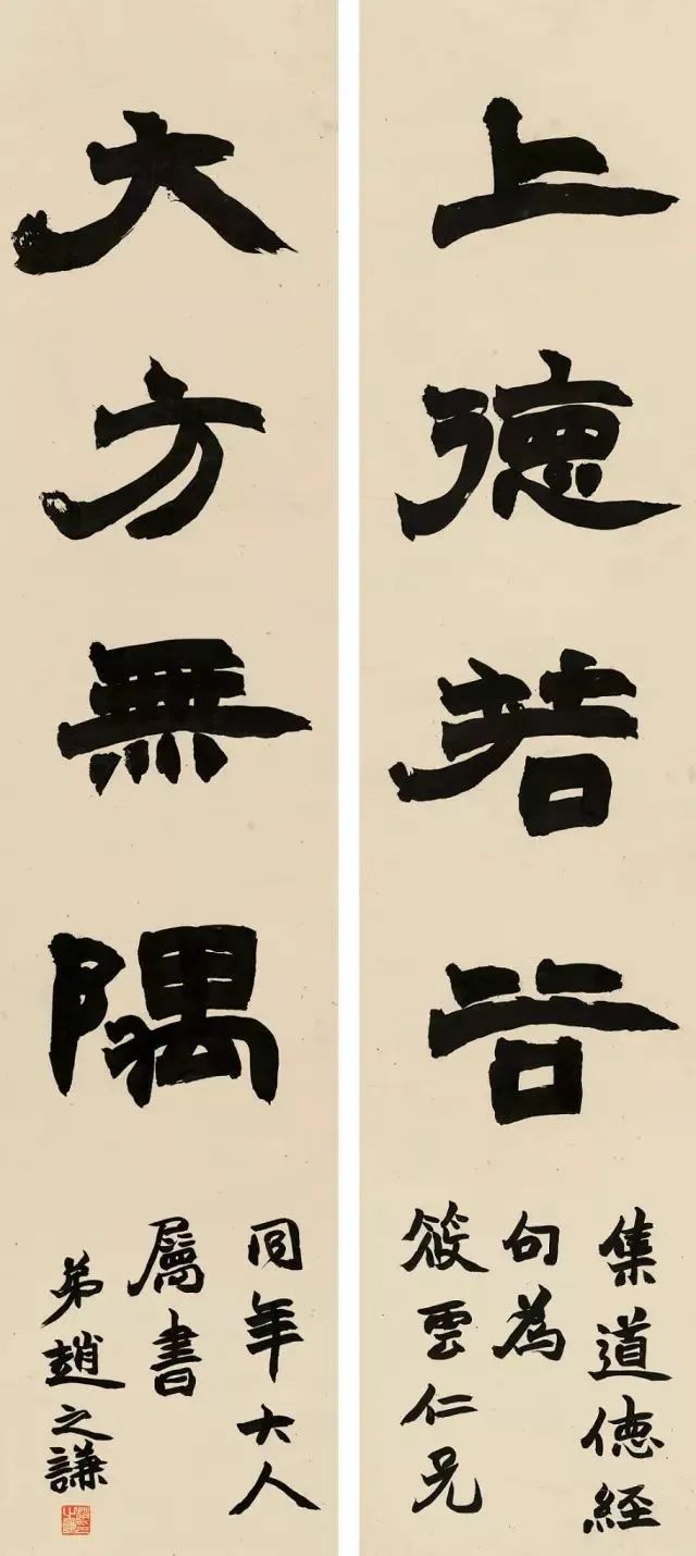 赵之谦(1829—1884),他重书写意趣,多有姿态,中侧锋之外,又以偏锋取势,自出机抒,其隶书结体宽扁,笔画肆意,有挥洒自在之态。行笔则寓圆于方,方圆结合。结体扁方,外紧内松,宽博自然。平整之中略取右倾之势,奇正相生。