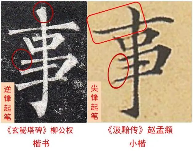 1. 尖峰起笔。因为字体小,小楷的起笔用尖峰起笔,不用逆锋起笔。