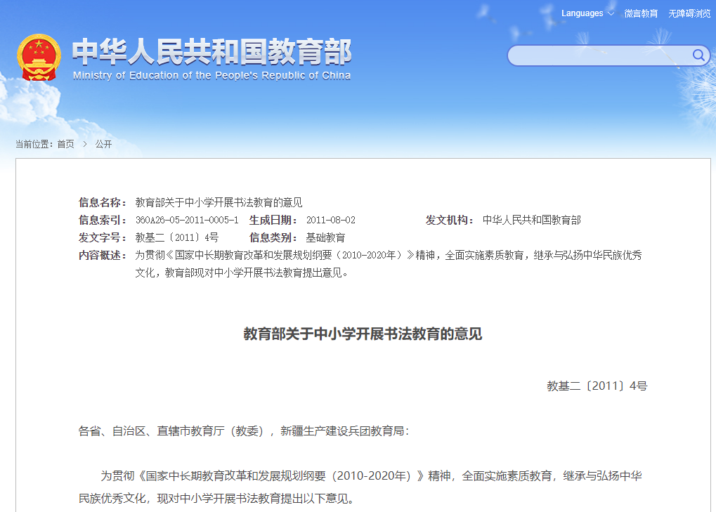 内容概述: 为贯彻《国家中长期教育改革和发展规划纲要(2010-2020年)》精神,全面实施素质教育,继承与弘扬中华民族优秀文化,教育部现对中小学开展书法教育提出意见。