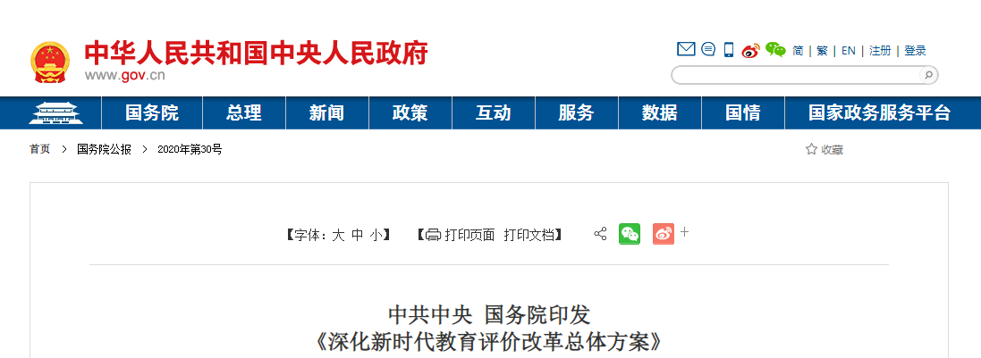 近日,中共中央、国务院印发了《深化新时代教育评价改革总体方案》,并发出通知,要求各地区各部门结合实际认真贯彻落实。